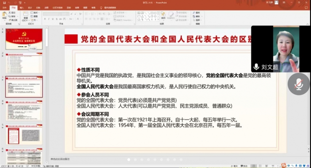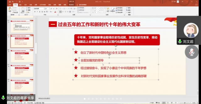 刘文超老师首先介绍了党的全国代表大会召开的时间和各自取得的成就,并向大家讲解了党的全国代表大会和全国人民代表大会在性质、参会人员及会议周期上的区别。接着,刘老师向大家介绍了党的二十大报告的主题,讲解了中国式现代化的五大基本特征,阐明了党的二十大精神的内涵,体现了人民至上的情怀,强调了敢于斗争,善于斗争的精神。最后,刘老师讲述了过去十年我们经历的对党和人民事业具有重大现实意义和深远历史影响的三件大事,并向同学们介绍了新时代新征程中国共产党的使命任务。
