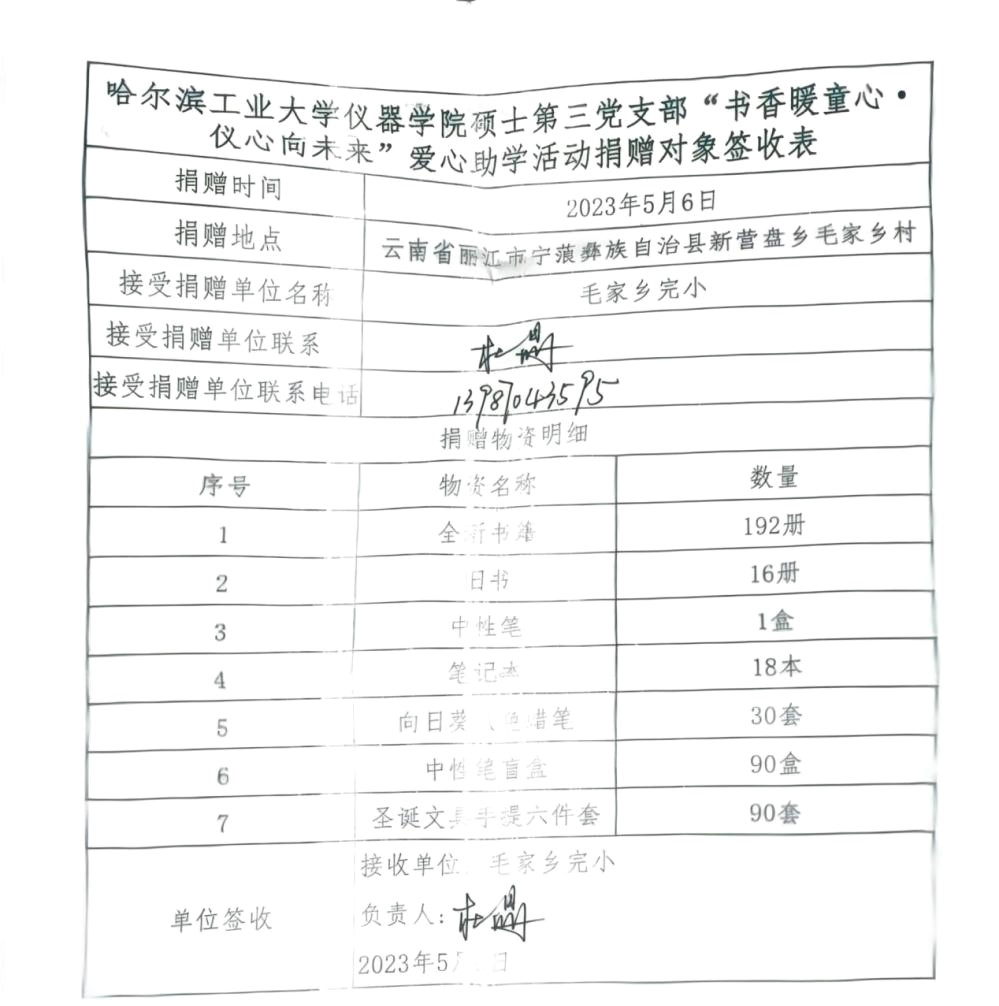 “书香暖心,仪心向未来”爱心助学活动为哈工大广大师生建立志愿服务、社会实践平台,同时助力山区儿童成长教育。本次活动为云南省丽江市宁蒗彝族自治县毛家乡完小募集图书文具,得到哈工大广大师生、校友及社会各界爱心人士的大力支持,共为毛家乡中心完小的孩子们捐赠各类书籍二百余册,文具200余套、笔记本若干。合计价值接近4000元。