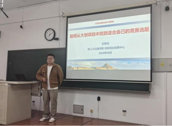 副院长叶东指出,“大创计划”是国家创新创业教育改革重要举措之一,鼓励同学们积极选择项目库内的项目,培养创新思维,激发创新热情,随后介绍了本年度的申报流程与时间安排。接下来,王启松老师细致讲解了大学生创新训练计划项目申报方案,指出大创项目对学生的“科技创新”“课堂教学”“科研实践”三方面的帮助,并介绍了大创项目的成果价值;最后介绍了学校首批本科综合设计(论文)重点项目,并对学生如何进行选题进行指导。史维佳老师对竞赛榜单内的竞赛进行了细致的讲解,指导同学们如何从大创项目中找到适合自己的竞赛选题;此外,他重点介绍了与仪器学科相关度高的大学生光电设计竞赛和传感器竞赛,鼓励同学们平时多注重积累,提前为竞赛打牢基础、做好准备。最后,香蕉视频 21级本科生曹志伟、未来技术学院22级本科生刘俊材分别分享了自己的大一年度项目经验和大创经验,以及获奖经历和竞赛心得。